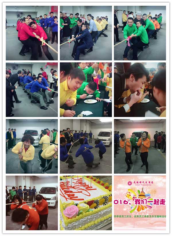 第四季度优秀员工分别来自7个部门的员工,对他们工作上勤勤恳恳的表现给予了高度的肯定,随后的生日派对更像是为辛苦了一年的员工准备的狂欢派对。而最后的趣味运动会更是将整场活动推向了高潮。时代大酒店八大部门分为A、B、C、D四个组,分别完成吃饺子比赛、下饺子跳大绳、拉车大力神以及拔河比赛,各项活动都是精彩纷呈,大家全情投入。最后,以绝对优势胜出的A组(财务部+安全部)和B组(客房部+工程部)成功问鼎,成为并列第一。