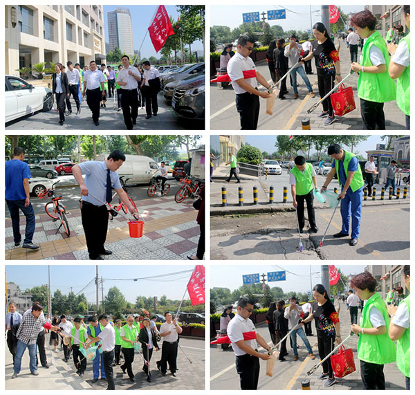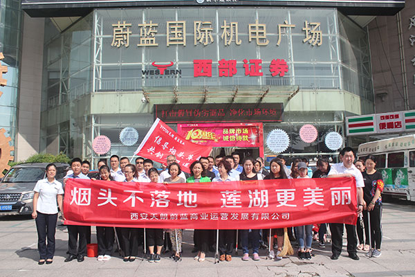 6月6日上午,天朗蔚蓝商业公司组织全体党员及部分员工、商户代表,联合莲湖区环西街办和大庆路社区共50余名志愿者从天朗蔚蓝机电广场出发一路向西捡拾沿路中的烟头垃圾。