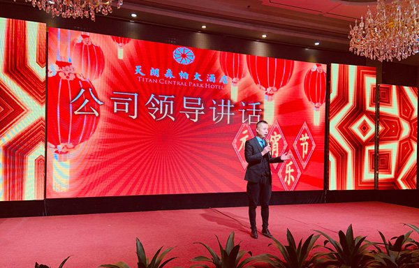 天朗森柏大酒店总经理王蓓女士进行了热情洋溢的讲话,感谢酒店员工一直以来的辛勤付出,使酒店的经营业绩取得了开门红,并为2019年新入职员工代表们送上新年礼物,祝福全体员工猪年大吉、“猪”事顺利、节日快乐、身体健康。预祝森柏酒店在2019年取得更好的成绩。