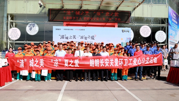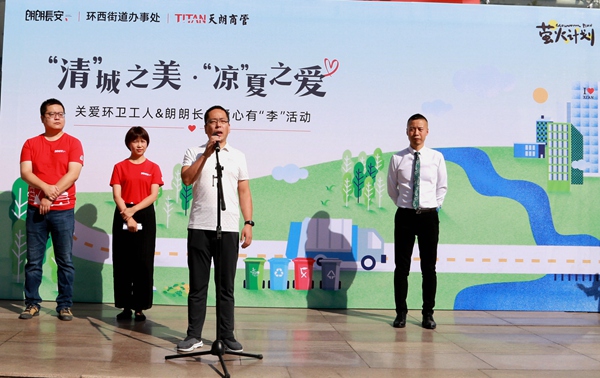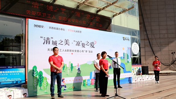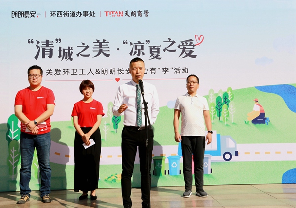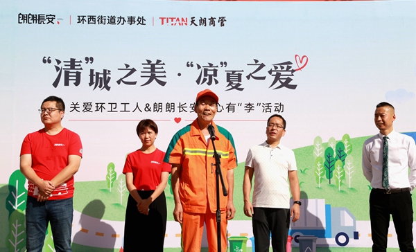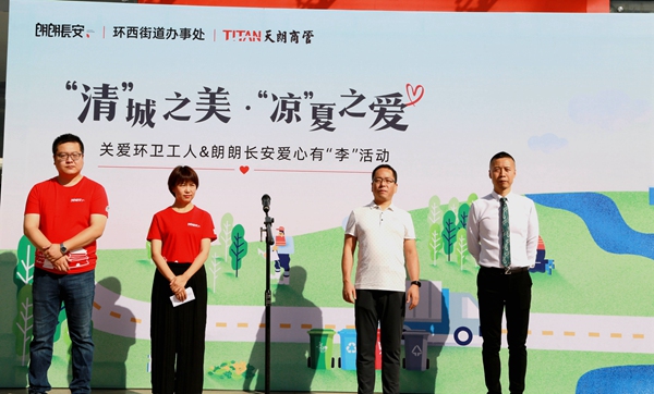 8月16日,朗朗长安、西安环西街道办事处、天朗商管公司在天朗蔚蓝机电广场携手举办 “清”城之美·“凉”夏之爱”——关爱环卫工人&朗朗长安爱心有“李”活动,莲湖区环西街道办事处主任严平显、莲湖区环西街道武装部部长雷雨、天朗控股集团副总裁周岗、朗朗长安负责人张倩、天朗控股集团品牌总监张楠、朗朗长安CO团队,以及环卫工人、保洁员、城市管理执法人员等一同参加本次活动,并为城市的环卫工人送上一份夏日的清凉与爱心。
