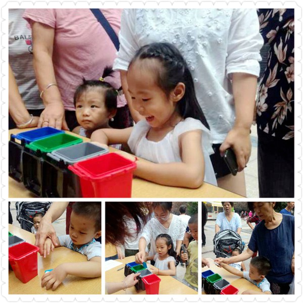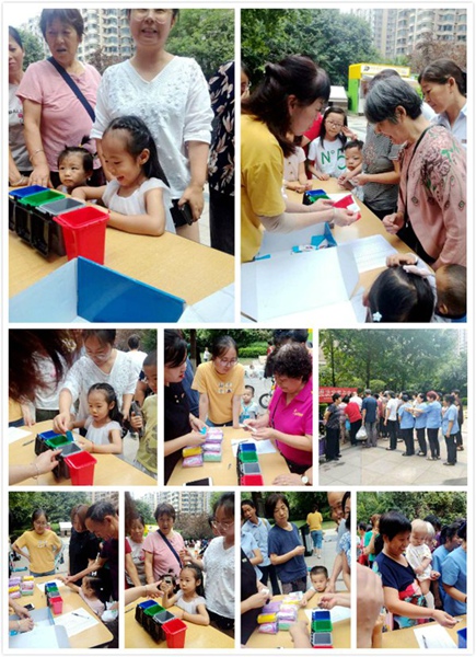 活动现场,熙熙攘攘,三五成群的老人和孩子,兴致勃勃地参与其中。工作人员为到场社区居民进行垃圾分类知识普及的同时,也给大家介绍一个朗朗上口的小口诀“能卖钱的蓝桶桶,易腐烂的绿桶桶,有毒有害红桶桶,没人要的灰桶桶。”