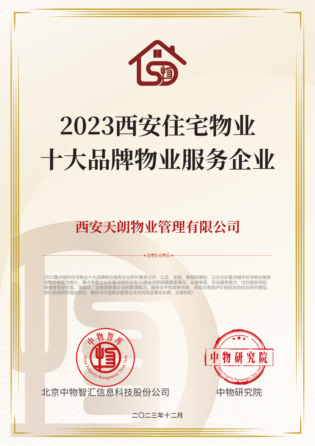2023年12月,由中物智库主办的“2023重点城市住宅/公建十大品牌物业服务企业”各城市研究成果隆重发布。天朗物业以优异成绩荣登西安住宅物业十大品牌榜单,彰显了企业品牌影响力与价值。2023年,天朗